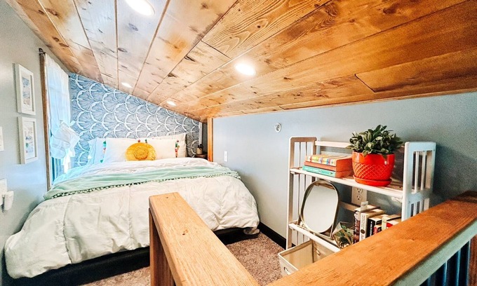 The cottage features modern amenities and thoughtful touches, offering a full sized bathroom, kitchen and living room with vaulted ceilings and a loft bedroom with an adjustable Simmons BeautyRest pillow top bed. The open-concept design allows for plenty of natural light to flood the space, creating a warm and welcoming ambiance.