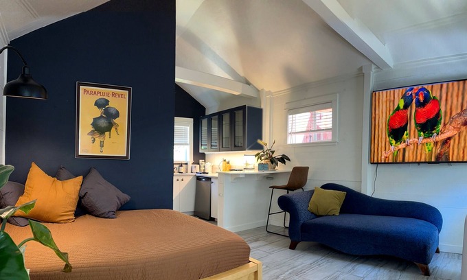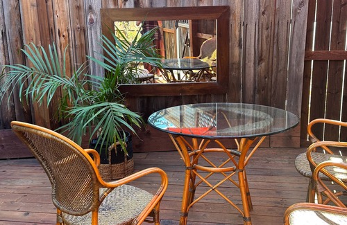 The Tipsy Turtle offers cozy peaceful seclusion in the heart of Guerneville fun. The studio space opens onto a large furnished deck. Fully enclosed by a tall fence, the space feels very private. Guerneville is a bowl of sunshine nestled between the Russian River and majestic redwoods. It is a small town with a uniquely friendly open culture. The Turtle House is located a block from Main Street right in the heart of town but feels like its own little world.