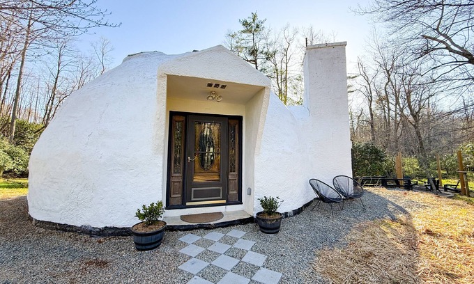 This round white marshmallow home is nestled in the VA mountains right off of the Blue Ridge Parkway! This remote hideaway is off grid and allows for a peaceful retreat with a bubbling brook next to the structure and a stunning outdoor fire pit space to toast marshmallows at - s'more ingredients are provided! Perfect for all seasons with an indoor fireplace that creates a warm atmosphere on chillier nights and a cool stream for warm summer days! You are sure to be relaxed at this unique getaway!