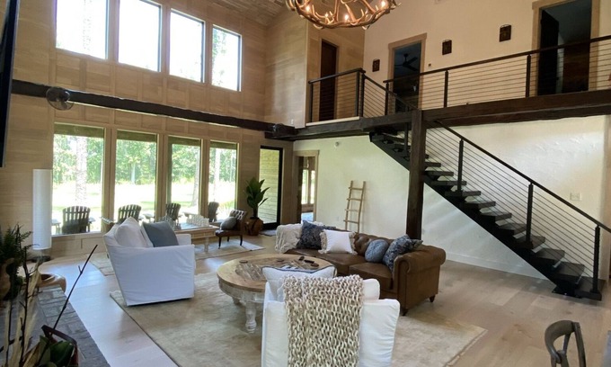 This exquisite three-bedroom, three-and-a-half-bathroom home boasts high-end amenities to ensure a comfortable stay for you and your guests. The grand living room features a soaring 32-foot ceiling and a captivating antler chandelier, creating a romantic ambiance. You can enjoy cozy evenings by the enormous gas log fireplace or gather around the 75" Roku smart TV. With fishing, kayaking, biking, and bird watching available right outside your door, there’s no shortage of activities to keep everyone entertained. The property is fully furnished and professionally decorated, providing a five-star experience in a secluded yet accessible location.