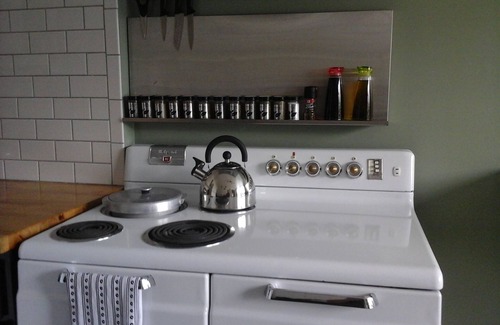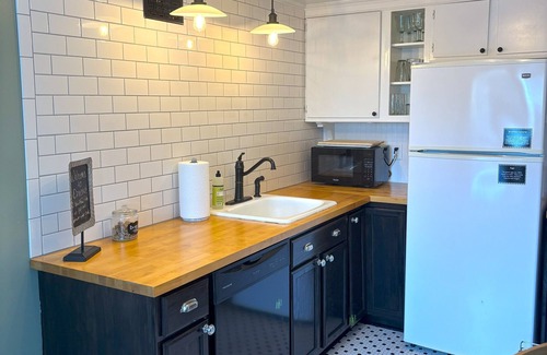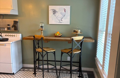 With a full subway-tiled kitchen you can cook fresh eggs in the morning from my chickens, enjoy your choice of coffee from the keurig, and butter a fresh baked treat left for each guest. Or have a wonderful weekend brunch at Sweetbreads just across the street from the house.