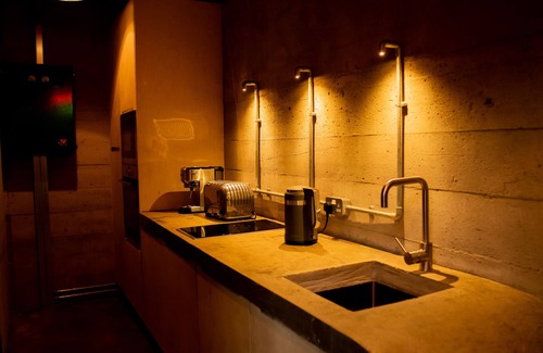 The Wash Tower near Bolsover, Derbyshire sleeps two guests in one king-size bedroom. Shower room with rainfall walk-in shower, basin, heated towel rail and WC. The shower room is separated from the bedroom by a steel divider. Kitchen. Sitting area.