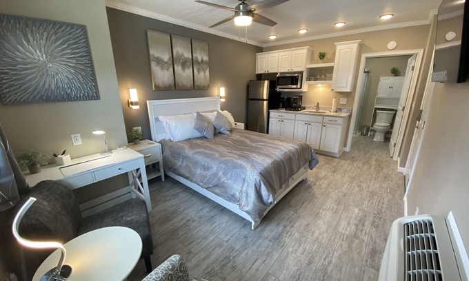 An elegant studio space newly renovated. Work space area w/ USB ports. WiFi /Spectrum cable. 50" Samsung LED 4K Smart TV. Kitchenette with granite countertops. microwave, 16 cubic ft fridge/freezer with ice maker, Keurig coffee maker, large sink, small kitchen appliances. Separate bathroom with shower, LED lighted mirror, Bath ventilation fan features Bluetooth speaker, dimmable LED lighting, two nightlight modes. Private covered porch entrance with outdoor seating. For us to maintain a consistency of high standards, we own, manage, and clean all our vacation rentals. We go above and beyond to provide you with additional amenities to ease the burden of traveling. We provide the following items for your stay; Toilet paper (4 rolls), paper towels (2 rolls), laundry soap, dryer sheets, dish soap, hand soap, trash bags, coffee, creamer, sugar, sweet & low, linens, extra pillows and blankets, hangers, first aid kits, shampoo, and body soap. We either personally check you in or we stage the unit for your arrival with lights on and ask that you contact us so that we know you have arrived safely. We own and manage the entire cul-de-sac, which includes 3 additional vacation rentals (The Farmhouse, The Beach House, and the Equestrian), as well as 11 long term rentals with great tenants. Our location to the World Equestrian Center is 2.8 miles, with a quick 5 min drive for your convenience. We live 5 min from the property and are available if you should need anything during your stay. We take pride in our properties and hope that you enjoy your stay and will book with us again at one of 6 properties.