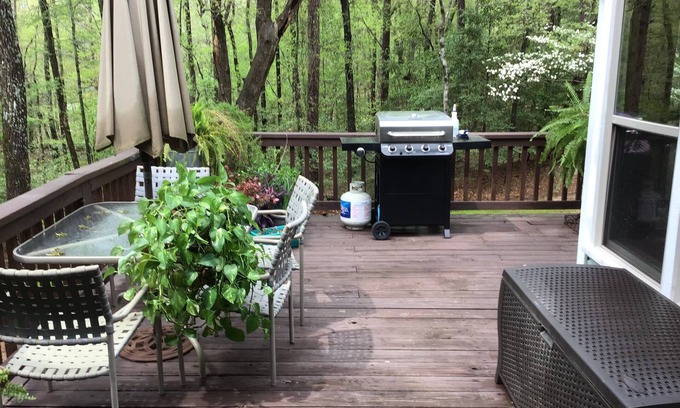 The Tree House sits on 4 lots at Holly Lake Ranch, TX, a resort in the piney woods of east Tx. It allows perfect privacy for our guests, you cannot see another house. The creek area at the back of the property is very secluded and even has a tree swing. It has an outdoor living area on the deck and a fire pit in the yard. Upon walking into the house it immediately draws you in with the stone fireplace and all the comfortable places to relax and enjoy company or just enjoy viewing deer in the yard. The entire impeccably decorated, furnished and stocked house will be yours to enjoy. The kitchen has the dishes and pans to prepare a gourmet meal.