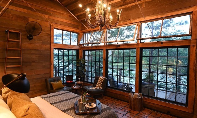 On the upper level, there is a huge outdoor deck that sits high in the trees and features a dining table and comfy outdoor seating area. And don't forget the outdoor bath- all of which has amazing view of the lake! NOTE: Outdoor shower and bath are unusable during winter months when temperature are near/below freezing