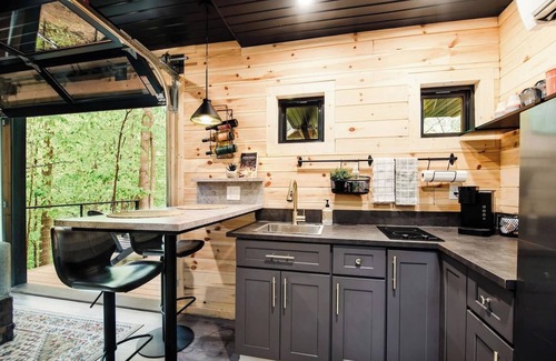 Down the spiral staircase you are welcomed with a nicely stocked kitchen which is equipped with a cook top, pots and pans, full size fridge, keurig coffee pot and sink.
