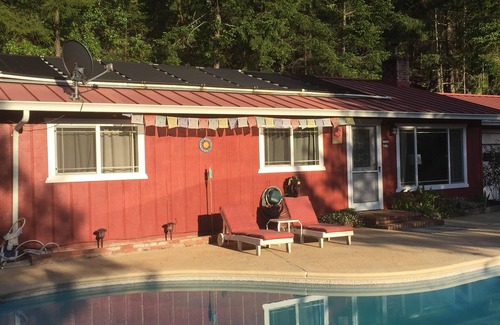 Come relax, explore and enjoy this well appointed private bungalow in the mountain sun. The Trinity River Rose house can accommodate up to 10 people with three bedrooms. One bedroom has full bed, 1 bedroom with a queen, and one bedroom with two bunk beds and a trundle that sleeps 6. All beds are outfitted with quality linens and duvet covers. Our fully equipped kitchen offers dining area and a grill and seating on the back patio for cooking up delicious meals. The living room offers cozy and comfortable seating with a wood stove, big screen smart TV, stereo and wifi access. Nicely equipped with games and books for adults and kids. Pool table and TV in the garage/game room for extra fun. Unwind in the landscaped pool area! Pool deck features 9ft deep solar heated saltwater pool, shaded outside dining, lounge chairs, umbrellas, lots of comfortable seating, and toys for water fun! There is also a grassy lawn area with corn hole and badminton to play games and enjoy a campfire (seasonal).