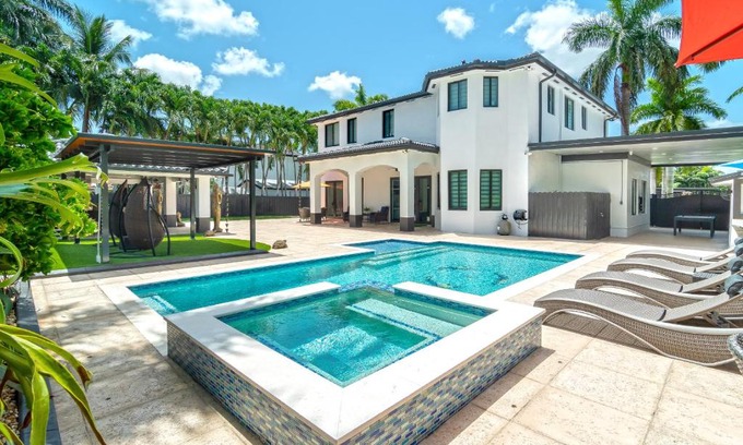 - This Miami Vice Villa home is a stunning Saltwater Heated pool/Jacuzzi spa Oasis