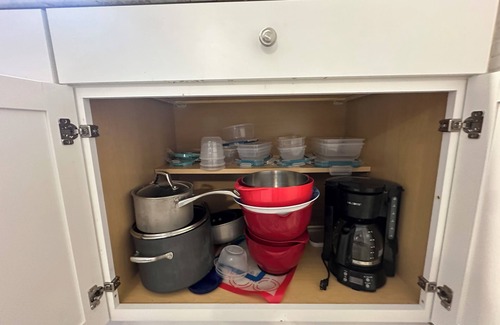 You'll find complete dishware, utensils, and essential cookware (pots, pans, and more) for all your cooking needs. There are also baking pans in the stove’s bottom drawer.