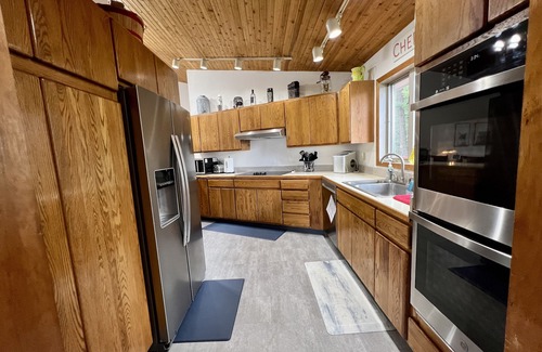 Both the main house and the dry cabin have fast and consistent Starlink Wi-Fi. The main house offers a 70” TV in the living room, board games, cards, and books. The large kitchen, with all new stainless-steel appliances, supplies everything needed for food preparation and dining including a double wall oven and a free-standing ice maker. The bar area has glasses, stemware, a cocktail shaker, and electric wine bottle opener. For families with small children, this home provides a portable highchair, pack n’ play portable crib and bassinet, plastic dinnerware, toys, and books. Enjoy a cup of tea or coffee while watching the sun come up. The coffee bar has a Keurig with a never-ending supply of water to the reservoir. There is also a 12-cup coffee maker, French press, and an electric coffee grinder. The game room offers a pool table and shuffleboard table, a mini fridge, and a pub table & seating. The large, fenced yard allows your pets to explore. Deer, bald eagles or the occasional fox, wild turkey, bobcat, racoon, or bear pass through the property.