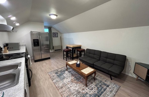 Welcome to this charming garage guest house in Alamosa. This rental features one bedroom with a cozy queen bed, a living room kitchen combo with a comfy futon, and a clean bathroom with a shower and a washer dryer. Guests can take advantage of amenities like a full kitchen, washing machine, WiFi, and heating or AC depending on the season. You will also have access to an outdoor patio area with a fire pit. Enjoy all that the San Luis Valley has to offer when you stay at our place.
