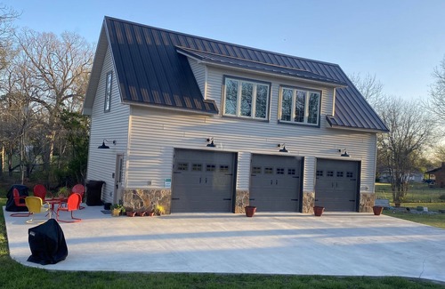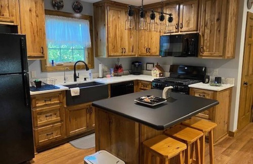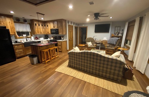 Newly constructed upstairs apartment with open living room/kitchen area with queen sleeper sofa. Bedroom with bunk beds and closet space. Many comfy pillows and blankets available. Kitchen well stocked with dishes and cooking utensils, pots and pans, ice maker, condiments, reverse osmosis system for drinking water and ice and a dishwasher. Bathroom has large shower, good lighting, a hair dryer and small containers of necessities just in case. Out on the patio there is a gas grill and a wood firepit.