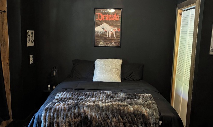Step into gothic charm and modern comfort at The Vampire Lodge. Our unique downstairs suite offers a queen bed, antique furnishings, private entrance, personal bar, and 2 outdoor patios (one enclosed with a tv!)