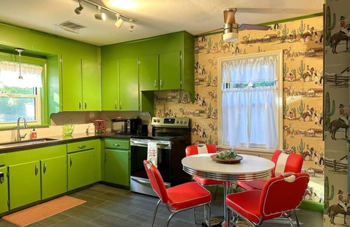 Located less than half a mile from Expo Square and right off Route 66 in the heart of Tulsa, Vandalia House provides spacious lodging for eight, fun family-focused amenities throughout, and a fetching midcentury rodeo vibe you’ll want to visit again and again.