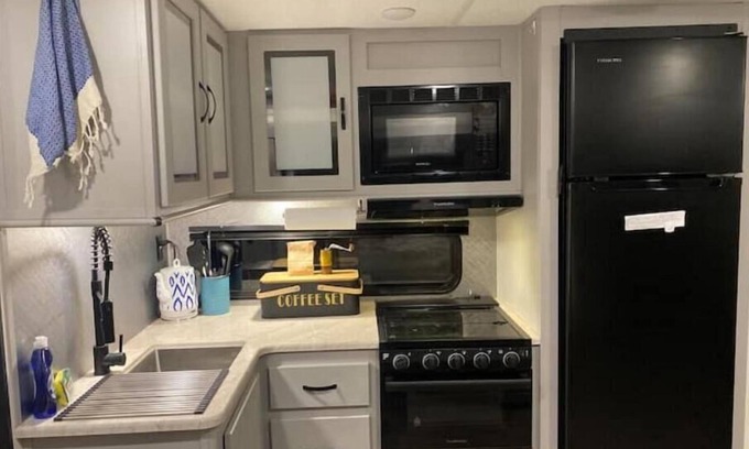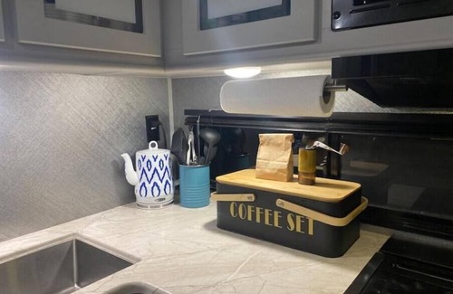 We have coffee, tea, a toaster, microwave, mini oven stove, fridge, freezer, etc!