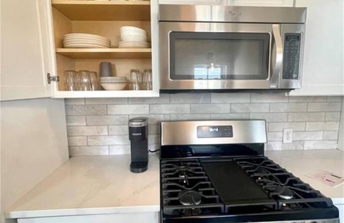 Inside the home you walk in the door to beautiful high ceilings. A lot of the original touches are still in the home but it's been updated with modern finishes. Each bedroom is on the opposite side of the home, separated by the living area and kitchen. Both bedrooms have a Queen bed. The primary bedroom has a HUGE bathroom with a very large walk-in shower.
