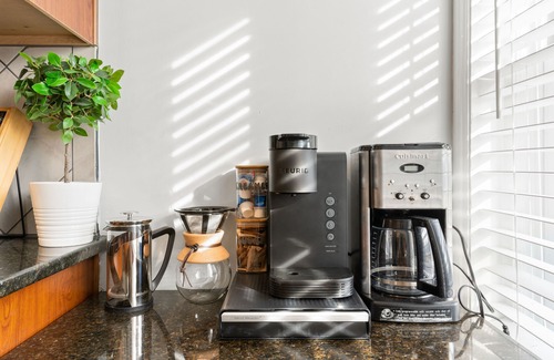 Elevate your mornings with our enhanced coffee bar, featuring multiple brewing options — drip, Keurig, pour-over, and French press — along with a curated assortment of k-cups, creamers, and sugars to indulge your preferences.