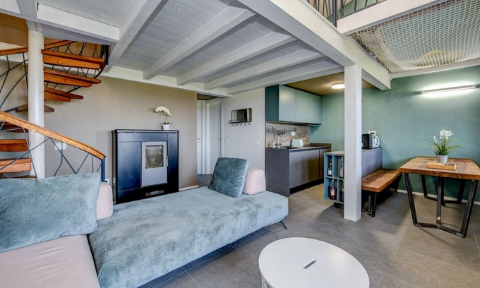 The apartment is on the first floor and extends over two levels, upstairs there is an open bedroom, downstairs there are two bedrooms, the bathroom and a living/dining area with an open, modern open kitchen, which rounds off the perfect living quality of this great holiday apartment.