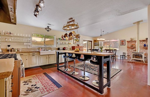 The Villa at Val du Vino Winery, located in downtown Murphys, is the ideal gathering spot for family and friends. A nicely remodeled, mostly single-level home with a relaxing pool, hot tub, grassy lawn area, front deck, back patio, and plenty of off-street parking, surrounded by 3 areas of open space and vineyards. The home sits just off Main Street adjacent the Val du Vino Winery, so you're about as close and convenient to downtown Murphys as you want to be, but without the traffic and parking issues. Just a few minutes walk to the Murphys Hotel, shops, restaurants, two dozen wine tasting rooms, community park, playground, bocce courts and the river. A comfortable and inviting floor plan with open living, dining and kitchen areas that make it an an easy place to gather. A gourmet chefs kitchen is well-stocked for cooking and entertaining, with a Dacor 8-burner gas stove and two ovens, refrigerator with automatic icemaker, microwave, dishwasher, coffee maker, French press, coffee grinder, electric tea kettle, toaster and blender, plus a gas BBQ on the patio. Coffee beans, half and half, teas, hot chocolate, and basic spices are provided. Five-star amenities like chocolates by the bedside, snacks, fresh flowers and free WiFi have it stand out from the rest. This home lives primarily on one level with three bedrooms, three full baths on the main level, one bedroom and a half bath downstairs. If you're looking to sleep 10, There is an another room downstairs with a set of bunk beds that can be opened up for an additional $100/per person per stay for up to 2 nights. The layout is a comfortable choice for guests of all ages, with a wheelchair accessible ramp from parking to the front door, and a stall shower in one of the bedrooms, making it easier for those with limited mobility. Other comforts include central heating and air conditioning, a toasty gas fireplace, laundry room with pool towels provided, a piano, two guitars, cornhole, all-age games and books to keep you entertained. A fully fenced backyard keeps pets safe and happy. Plenty of off-street parking for vehicles, plus a level spot on the concrete basketball pad to park a boat. On some Thursday evenings we host an all acoustic open mic in the music barn next door, and you are welcome to drop by to watch or participate. If you're looking for that special, 5-star getaway, the Villa at Val du Vino Winery is the perfect spot to sip, soak and stay