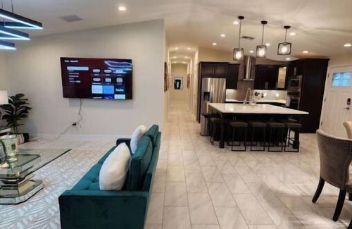 ⭐Super Stylish and comfortable open living room- kitchen & dinning space - 75" Roku TV so you can login & stream your favorite app channel services. The couches serve as an option to sleep 🛏️ an additional 2 guest.