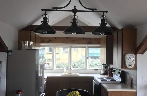The Village Bungalow is a spacious second story one plus bedroom Flat with village views and some ocean peeks. The home is open and bright with many large windows. The master bedroom has a queen sized bed and a full sized bed. The full sized bed is in a nook off to the side of the master bedroom, with barn doors to close off the space. The third bed is a queen, it is in a nook off the living room it also has barn doors for privacy. The location is close to shops, grocery stores and restaurants. if you have forgotten anything the grocery store is a 2 minute walk away. The flat is above a hair solon and a copy shop. The space has beautiful hard wood floors and a new rustic bathroom in the master bedroom.