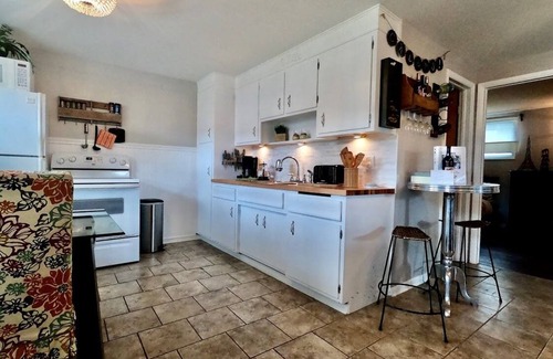 Kitchen: Upon entering the flat, you'll notice the bright and cheery updated kitchen fully stocked with all the essentials you'll need to make your morning coffee fix, stay-in dinners, or late-night popcorn snack. (Spices and all!) There is a Refrigerator with Freezer, Oven/Stove-top, Microwave, Sink and lots of cabinet/pantry space to store your groceries. We have a lot of great appliances: Blender, hot water kettle, coffee pot, hand mixer...even a Crock Pot! We try our best to provide you with the conveniences of home, but if there's something you're missing, please don't hesitate to ask. We may very well have what you need! :)