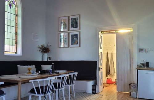 The bedroom and bathroom are secluded in what was the old vestry and Sunday school. Wake up refreshed in the comfy queen bed to the sound of birdsong and views through the french doors over the garden and beyond. The large bathroom has a repurposed vanity, luxurious underfloor heating and an oversized shower. Take time to relax and unwind in the deep bathtub after a day of exploration around the local area.