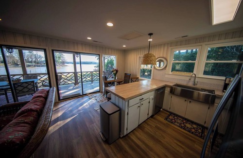 YOUR LAKEHOUSE: Fully remodeled One story living with one step into your waterfront lakehouse. Beach-type entry lake and nightly sunset views! Room to maneuver, park cars & trailer! Sleeps up to 6.