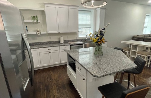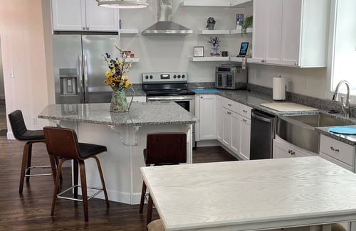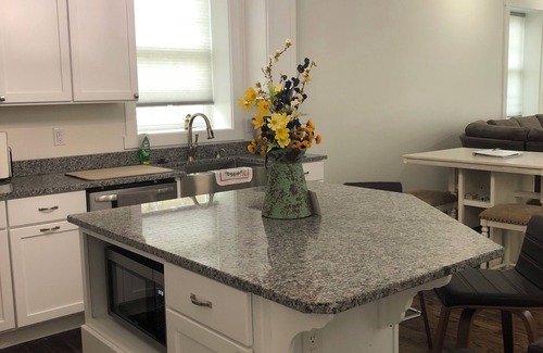 One of the original owners, a carpenter, moved into the house in 1907 and added the side hall onto the east side of this shotgun house, giving it the privacy needed for the family. He had immigrated from Germany and took a job working at the button factory in town. Hardwood floors, a modernized full kitchen with granite countertops, and king-sized beds with full tiled bathrooms make this house a comforting getaway.