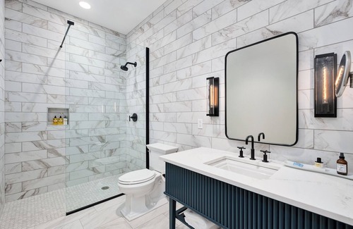 The spacious full private bathroom provides a refreshing zero-entry shower and is fully equipped with a Dyson hairdryer, luxury toiletries by D.S. and Durga, and luxurious Red Land Cotton towels, crafted in Alabama.