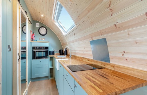 Shower Room: Cubicle Shower, Toilet. Electric central heating, electricity, bed linen, towels and Wi-Fi included. Welcome pack. Front garden with sitting-out area, garden furniture and firepit. Hot tub for 6 (private). Private parking for 1 car. No smoking. Please note: No children under the age of 18 years old.. The Warren offers modern and light accommodation for up to two guests in this well-designed and tastefully decorated pod. It is an idyllic retreat, perfect for a romantic getaway. Featuring a kingsize bedroom with a smart TV, high-quality mattress and soft linens to ensure a restful night’s sleep, an open plan lounge, dining and kitchen area, with the kitchen offering an electric hob, combi microwave, fridge and dishwasher so you can easily prepare meals of your choice to enjoy. There is a tucked-away breakfast bar with stools and a cosy sitting area with a comfortable sofa and TV, the perfect spot for winding down after a busy day exploring, with double patio doors offering a lovely view across the fields of Brookfield Farm. There is a shower room within the pod where you can freshen up before watching the evening roll in, or awaken yourself for the day ahead. To the front of the pod is an enclosed garden with a patio area where outdoor furniture is available and a firepit where you can sit and enjoy the summer evenings, plus a hot tub where you can perfectly watch the night sky role in the beautiful surroundings.