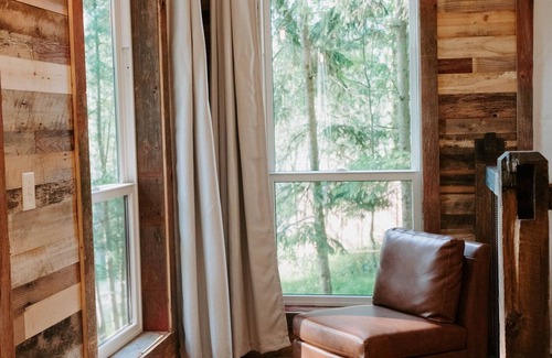 Near the entrance of Mill Creek Cabins, The Water Villa is shielded by a large privacy fence created using the pines that once stood on the hillside where the cabin is now situated. A sliding door opens up to reveal a pathway to the two-story cabin lined with windows. The main floor fills up with natural light featuring a king bed, balcony, small seating area, and fireplace. Reclaimed barn wood walls and large windows create a warm interior highlighting the outdoors.