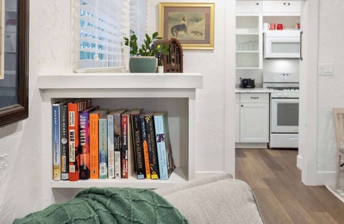 As you enter the house, you'll find a cozy living room with a couch, Smart TV, and dining area. The kitchen and laundry room are to the right, and down a hallway to the left you'll find the bedroom and bathroom. The home has air conditioning and heating, and stays comfortable throughout the year. The kitchen has all full-size appliances and is stocked and ready with all the tools you'll need to cook meals while you're in town. There is one bedroom, and the home has a max capacity of 2 guests, or 2 guests and one small child.