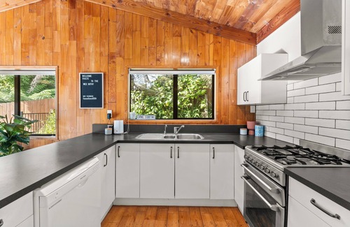 Ideal for families, couples, or groups of friends seeking a peaceful beach escape, the open-plan living-dining area is bright and refreshing, offering ample space for relaxation. The well-equipped kitchen allows for convenient self-catering, while the lounge opens onto the deck for soaking up the sun and bush views. Entertainment options abound with a Smart TV featuring Freeview and Netflix.