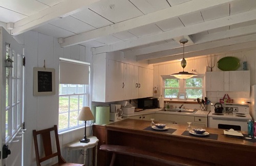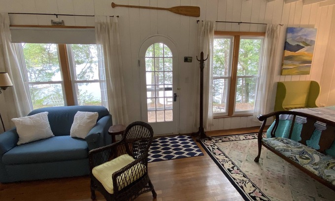 The Wee White Cottage is a small, but very comfortable and very clean lake side cottage on the west side of Tripp Lake, 125 Fernald Drive, Poland, ME. The lake is just steps outside the door! Great spot for fishing, kayaking, watching the loons, the eagles and herons. The sun rises directly across the lake, and the dock is a perfect spot for a cup of morning coffee. This is a studio arrangement with a lake view living area, a QUEEN size bed, pull out queen sofa, and a pull-out twin bed, fully equipped eat-in kitchen (no dishwasher), clean bathroom, with stand up shower. Suitable for a couple, or close friends. The cottage has an assortment of new and antique furnishings. It's very clean and very quiet. Window unit air conditioner.
