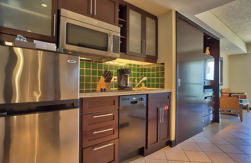 Well-equipped kitchenette with two-burner cooktop, microwave oven, compact refrigerator with icemaker, dishwasher, coffee maker, toaster, blender and dinnerware