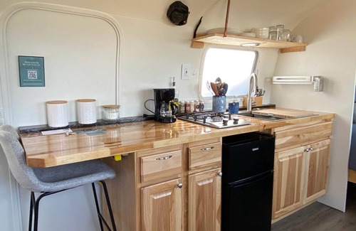 Perched on a bluff overlooking the Pacific Ocean and Nesika Beach, this beautifully reimagined Airstream was expanded to create more space and stunning views. The open floor plan opens onto a private deck with a FIRE PIT, HOT TUB, and OUTDOOR SHOWER, perfect for watching sunsets and stargazing.