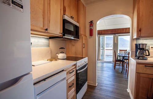 Amenities include a fully furnished kitchen, ocean view living room and dining room, HDTV/ DVD Player, Wifi, FM tuner with iPod cable. Be sure to check out our latest addition: a recently added mural painted by Oregon muralist Corie Hinton. It is a visual treat waiting for you when you open the kitchen door.
