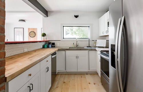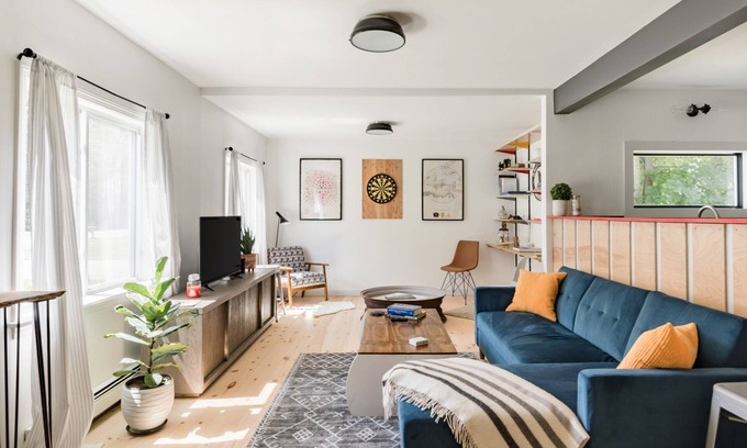 Open the local wine provided and stretch out on the blue sectional sofa in the sunny living room. The fun and stylish decor is a modern interpretation of the area’s agricultural roots, with wood floors and exposed-brick accents in the loft bedroom.