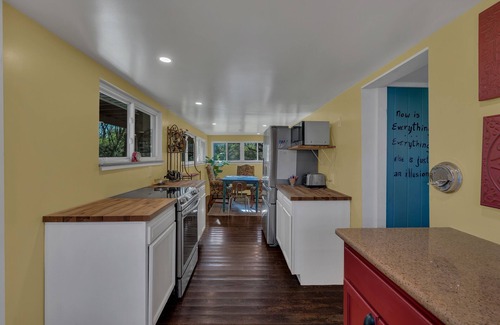 The grand entry parlor is perfect for large group hangs, while the cozy bedrooms keep everyone from feeling on top of each other. Many families have made wonderful memories here—now it’s your turn! Rustic charm and modern amenities make this place perfect for a quiet retreat or a celebratory gathering. And don’t miss a visit to Dee’s Lounge or Eastside Bowl, both local favorite hangout spots. Enjoy cooking up meals in the modern open kitchen looking into the dining area. Lounge in the large living room/vintage parlor with an old-fashioned pop-up tv. Settle into the comfy two bedrooms on the upper floor, each with additional bunk rooms for more guests. Enjoy an office with a large desk for those that need a quiet place to work while others relax. There is Google Fiber internet with Wi-Fi throughout the home and a laundry area on-site. There is a beautiful large outdoor space for entertaining guests or enjoying the wildlife. Have your camera ready to capture deer, bunnies, and a menagerie of birds.