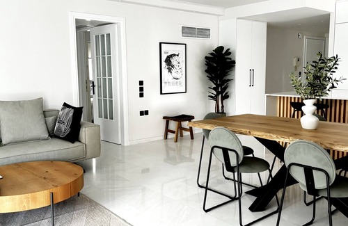 Our freshly renovated apartment is located at the heart of Paleo Faliro right across Floisvos Marina. The space offers 4 bedrooms, 2 full bathrooms, spacious living room with open kitchen and American bar. There are 3 queen beds, 2 twin beds and can accommodate up to 8 guests. It has a 40 square meters of balcony with outdoor dining space and lounge area.