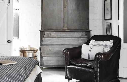 The room features beautiful french pure linen, bespoke pieces of furniture including a leather club chair, industrial cabinets, paintings sourced from flea markets around the world, original art work and one off finds.