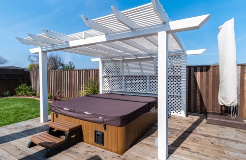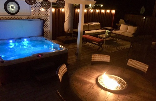 The studio has newer laminate flooring, marble countertops, butcher block island, custom Shaker style cabinets with soft close and glass subway tile backsplash. The unit has a full stove top and oven with microwave and fridge. There is a living room area with a large flat screen TV as well as newly installed air conditioning and heating. We offer high speed internet/WiFi, premium cable TV with hundreds of channels and free on demand movie options. The spacious backyard oasis is shared with main house guests but there is a side patio right off your front door that can serve as your private area. The Jacuzzi hot tub, a Weber propane grill and two fire pit tables are available for use to everyone at the home. The entire perimeter of the property is monitored with security cameras for additional safety.