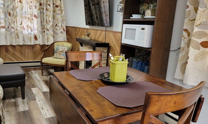 One of the 1936 original stand-alone cabins, the White Tail is something you must see and experience. After a long day, unwind in our oversized super comfortable chairs with your favorite beverage in front of a warm electric fireplace and 50 inch TV with UTube TV. Perfer to watch TV in bed -- not a problem -- there's a TV in the bedroom. It's easy to prepare a full meal or snack with thefull-sized stove, microwave, air fryer, crockpot and toaster. We also provide thepots, pans, silverware, plates, bowls, glasses andcooking utensils. Complimentary coffee will get your day started.