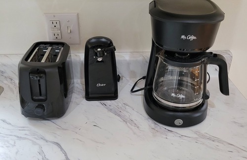 The kitchen has all the appliances and utensils you would have in the comfort of your home. There is a starter of garbage bags and dishwasher tabs provided.