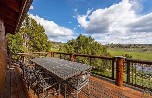The back deck looks over a spring fed pond, horse pastures, mountains, and valleys. It has plenty of seating and a grill for enjoying the beautiful views.