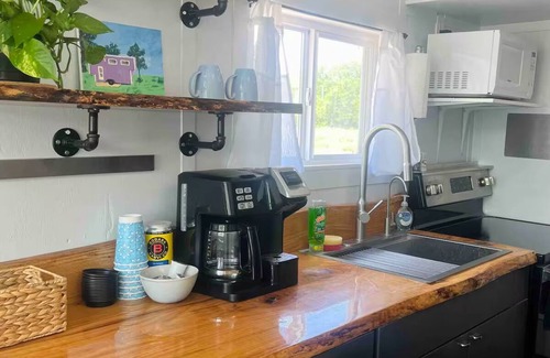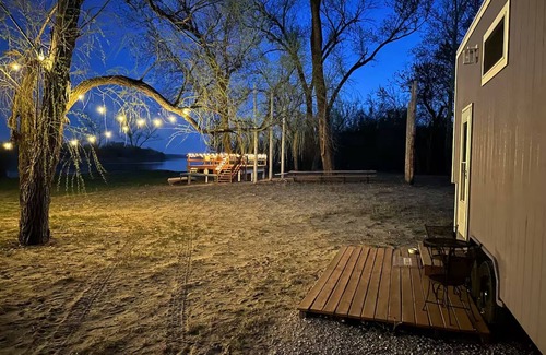 Bathroom with shower, on demand propane hot water heater (usually works lol). Full size fridge, stove, kitchen sink and microwave. Tiny home sits on 10 acres that is waterfront to the main channel/current of the Missouri River. There are a few RV/camping spots about 200 yards away. Outdoors with small patio with chairs, fire pit near the river. Terrain is mostly flat with some grass and sandy areas. Elevated gathering deck that is a common area for all guests of the tiny home and RV spots. You may fish and have shore fires at your own risk on the banks of the Missouri River. Bring your own fishing gear.