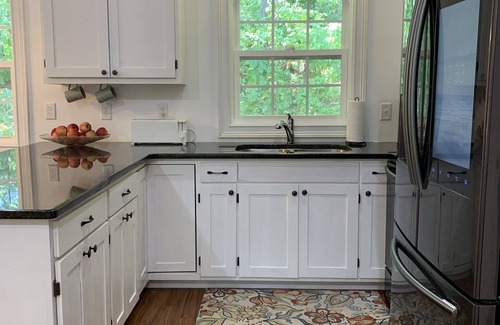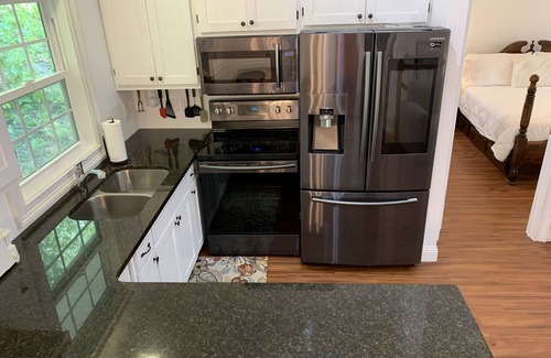 The most beautiful 2 bedroom, 2 bath loft apartment you ever “saw” “plane” and simple. It is on a quiet cove at Lake Wedowee, 5-6 miles from town. Gently sloping walk to lake, part being a boardwalk. Private apartment with parking and private entrance. You will have shared dock access with property owners. Dock has recently been renovated and enlarged with pergola and boat docking space. Modern fully stocked kitchen with new appliances. Master bedroom with king bed and private bathroom. The other bedroom is on the opposite side of the apartment. It has a queen size bed and complete bathroom a few steps away from bedroom. Entire apartment has been recently remodeled and updated. A retired carpenter and his wife (the Woods) live next door and are the owners. Washer, dryer and large screen (65inch)TV with DirecTV service. You will have no problem “chiseling” out time for fun. Sleeps 4 in beds with room for an additional 2 persons. No cleaning fee!