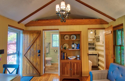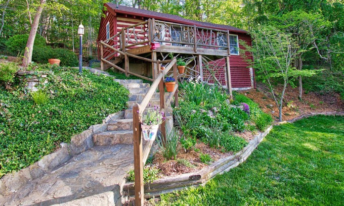 The Woodlands Cottage is a popular cottage for couples due to generous accommodation and deck with views of mountains and Hendersonville Country Club. The cottage offers a secluded feeling, natural setting, outdoor space, but also within minutes of Downtown Hendersonville & Historic Flat Rock.
