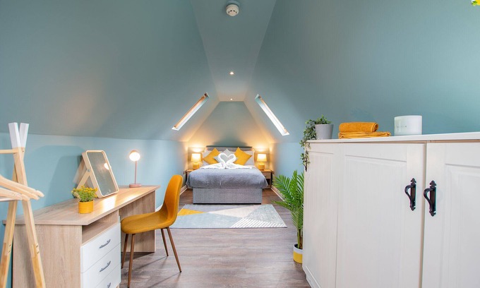 Experience luxury and convenience with The Yellow Door's modern amenities, including an open-plan kitchen, living, and dining area perfect for communal dining and entertaining. Each bedroom offers unique sleeping arrangements tailored to your needs, ensuring comfort for everyone in your party. After a long day of wedding festivities, unwind in the inviting cinema room, complete with a 65-inch smart TV and cozy seating—ideal for relaxing evenings or post-wedding movie nights.